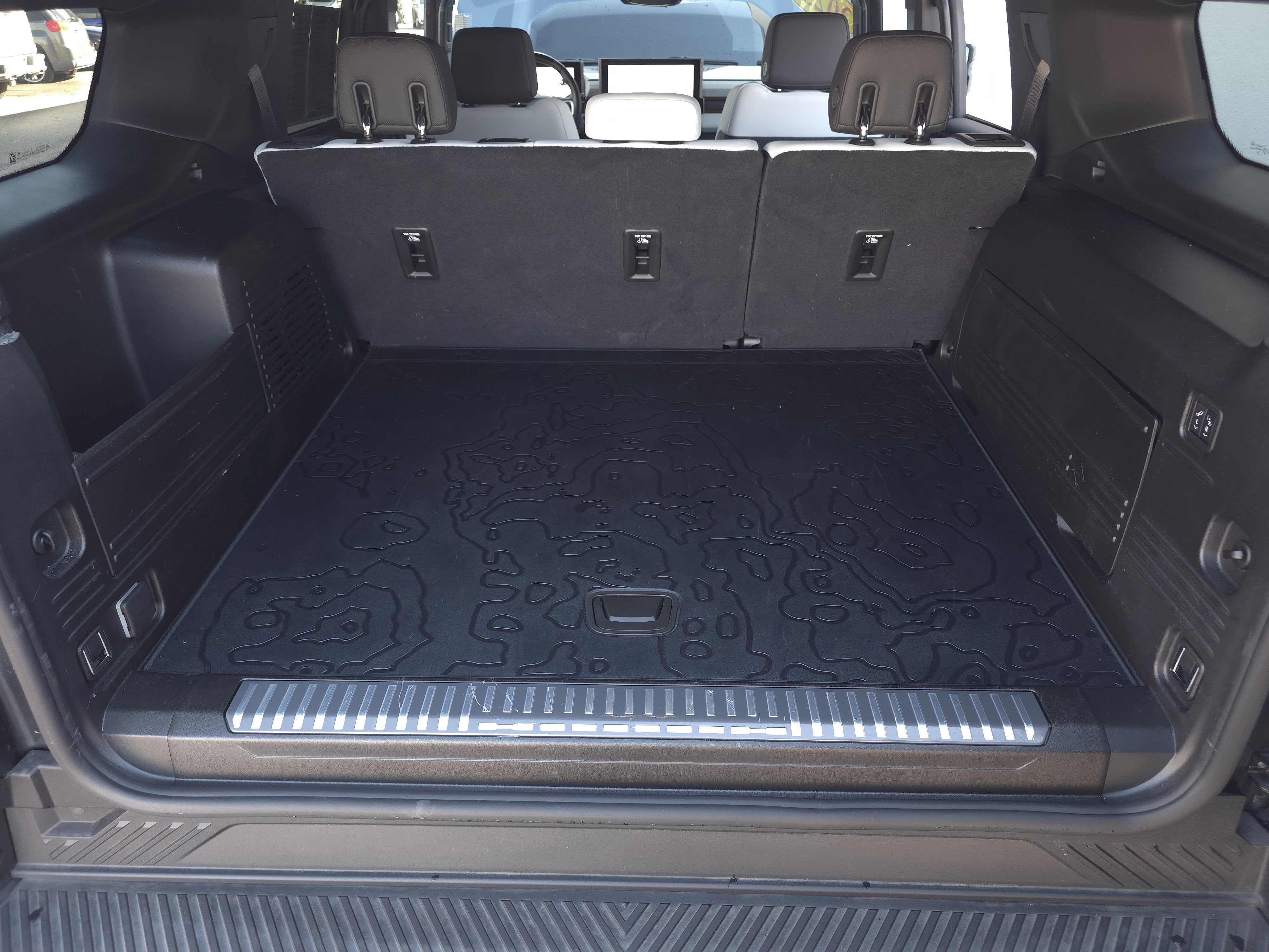- eTrunk lit compartment with Infinity Roof Sky Panel storage capability, cargo tie-downs (4 rated at 110 lbs.) and 12-volt power outlet